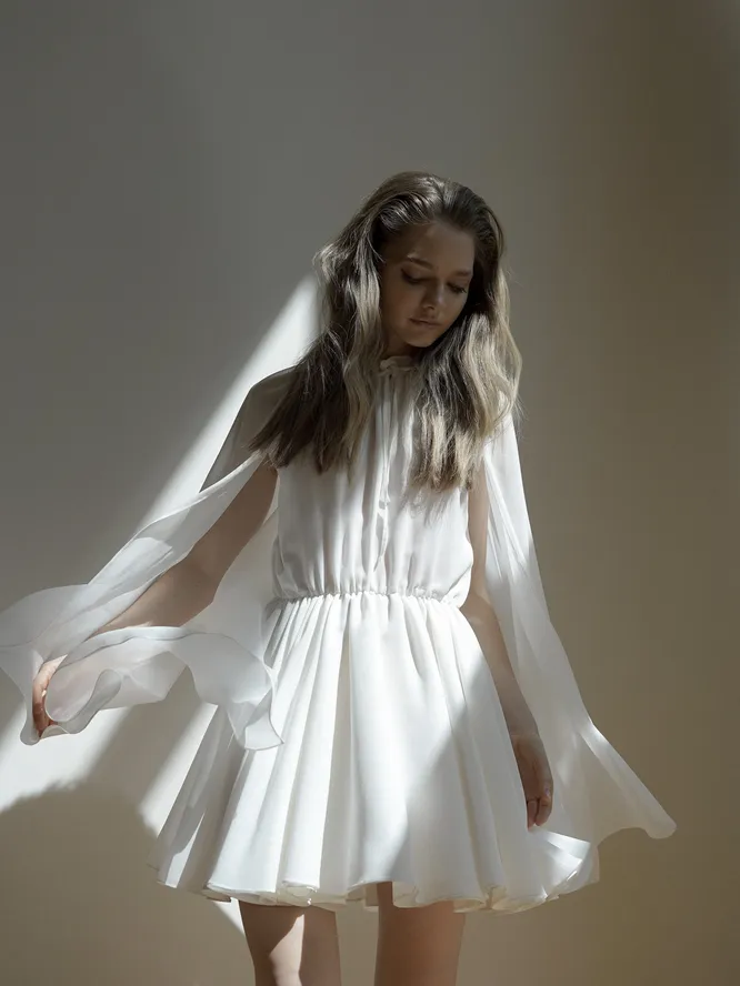 Еще одно платье, мимо которого мы не смогли пройти. Шифоновый кейп, закрепленный на плечах, при движении похож на крылья — белые и невесомые. Еще один идеальный вариант для летнего свидания или выпускного — кстати, подборку мини-платьев для выпускниц мы тоже уже сделали.