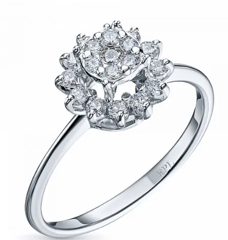 Роскошное кольцо Хало (Halo) из белого золота с бриллиантами выполнено в уникальной авторской манере. Камни расположены в 2 яруса. В верхнем один небольшой бриллиант окружен россыпью из 6 более крупных камней. А в нижнем ряду находятся еще 12 бриллиантов. На руке такое красивое кольцо с бриллиантами будет смотреться очень эффектно. Оно выглядит винтажным, хотя и является современным.