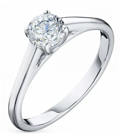 Кольцо с большим круглым бриллиантом из белого золота в классической оправе. Она называется закрепка Тиффани. Камень вставлен в гнездо и закреплен 4 или 6 лапками. Впервые закрепку Тиффани запатентовала компания «Тиффани & Co». Считается, что эта форма оправы позволяет бриллианту лучше проявить блеск.