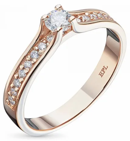 Кольцо с бриллиантовой крошкой из красного золота создано из одного крупного центрального камня и 17 мелких в канальной закрепке. Ювелир так подобрал камни, что вес большого алмаза почти равен общему весу мелких. Поэтому внимание зрителя сосредотачивается не на одном камне, а сразу охватывает всю сверкающую часть кольца.