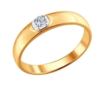 Это кольцо с бриллиантом золотое – тоже типичный солитер. Внимание зрителя направлено на камень и не отвлекается на другие элементы. В нем использована глухая закрепка, у которой есть и плюсы, и минусы. Плюс в том, что это самый надежный тип крепления. А минус состоит в том, что камень кажется визуально меньше, чем есть на самом деле. Форма огранки — Кр57.