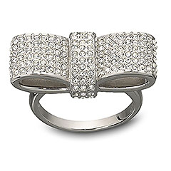 Следующий номер в нашей программе: кольцо в виде банта. Эта модель выглядит игриво и заманчиво. Оно состоит из большого количества белых кристаллов. При попадании света будет искриться и играть различными цветами.
