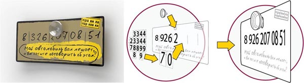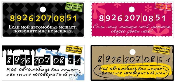 Вариант №1. «Правила парковки» – это новые парковочные визитки для автомодниц, которые оставляют свои машины в неудобных местах города. Вот такую чудесную бумажку девушка, оставляющая своего «любимца» на незнакомой улице, вешает на присоске на лобовое стекло, предварительно наклеив на нее свой номер телефона из кассы цифр.