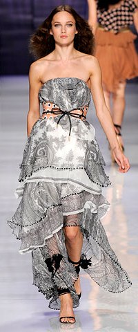 Очень сильная получилась коллекция. Легкость и полет, цыганщина и хиппи. Разлетающиеся платья, свободного покроя брюки и блузы из полупрозрачных тканей, однотонных или с разноцветными абстрактными принтами, но однозначно пастельных оттенков. Обнаружились в коллекции сочетания платья и брюк в одном комлекте (похоже, это уже тенденция). Интересные детали: шнуровки, выполняющие роль декоративных «рукавов», а также множество широких воланов и рюшей.
