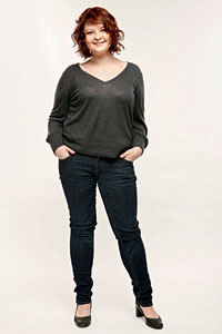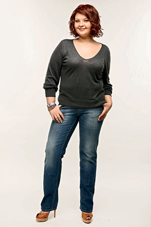 РЕШЕНИЕ: Свитер можно оставить, но Насте не надо стесняться глубоких вырезов. Она то и дело сдвигала его назад, уменьшая декольте, я же советую делать наоборот. А вот джинсы нужны другие – прямого силуэта: такие визуально удлинят ноги. Плюс яркие туфли на каблуках. Минимум усилий, а Настя выглядит женственнее и стройнее.