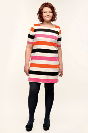 РЕШЕНИЕ: Платье прямого силуэта – это раз. Короткое и яркое – два. В полоску – три. И удивляться тут нечему. Главное, запомнить правило: если в изделии горизонтальные деления (полосы) многочисленны и промежуток между ними небольшой, то возникает иллюзия вытянутой вверх фигуры. Если полос немного и они нечастые, иллюзия исчезнет. Итог: Настя как будто похудела на размер, а то и на два.