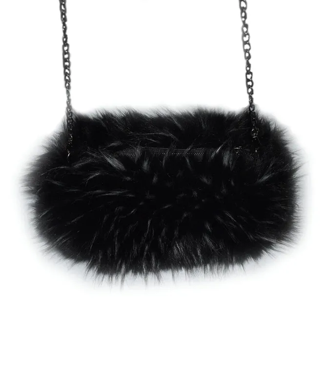 Еще один вариант муфты-сумки, но более элегантный. Аксессуар из черного искусственного меха на цепочке станет стильным дополнением не только к верхней одежде, но и к вечерним нарядам. В первом случае предлагаем носить муфту с классическими пальто или шубой, во втором – с нарядными платьями в пол, бархатными брючными костюмами, короткими платьями или комбинациями.