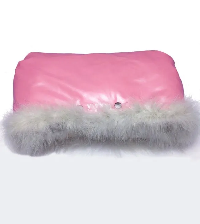 Еще один вариант – муфта для коляски с фактурой под кожу и меховой отделкой. Она защитит руки от сильно ветра, а флисовая подкладка будет хорошо греть и удерживать тепло.