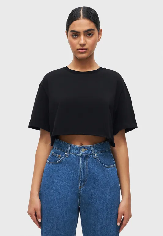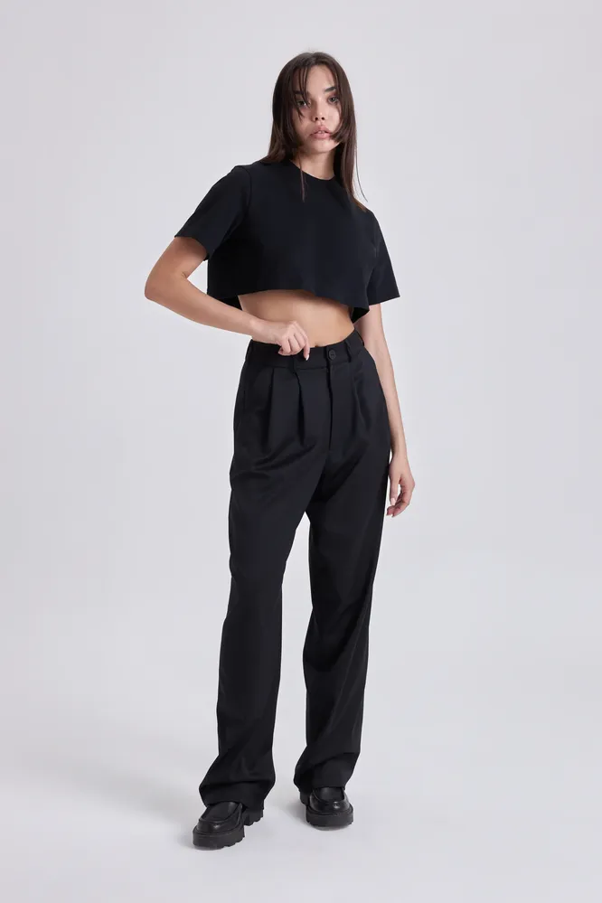 Кроп-футболки будем носить, пока совсем не похолодает. Миксуем с джинсами на высокой посадке и брутальными кожанками — вариант на каждый день. Кстати, короткий топ можно подружить и с джоггерами, и с брюками с лампасами — а к ним в компанию добавим тренч и мартенсы. Удобно до неприличия!