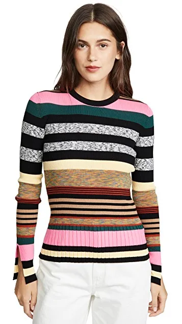Даже базовый джемпер в полоску может стать основой трендового образа за счет графичного рисунка: добавь к нему темные брюки клеш, чтобы вытянуть силуэт, и ботильоны с геометричным каблуком.