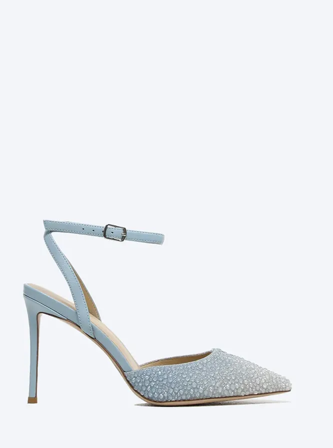 Не обходим стороной стразы. Прозрачные – открытие сезона: они похожи на капли росы, застывшие на мысе твоих слингбэков. Но котируются камни любых цветов и размеров, как, впрочем, и сложные в стилизации в туфли с чулком-сеткой. Обычно их сложно вписать в образ, но в праздничное комбо они так и просятся.