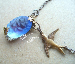 Сделанное вручную, выглядит оригинально и неповторимо. В ожерелье гармонично сочетаются: капля небес из голубого стекла филигранной работы и ласточка. Оправа, опоясывающая небо и предвестник весны сделаны из меди.