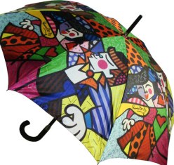 ![]() | Для того чтобы разбавить дождливый день красками, выбирай зонтики с рисунками современных художников. Нам больше всего нравится вот такой – по мотивам картины супермодного бразильского художника Ромеро Бритто, работающего в стиле неопоп-кубизма. |