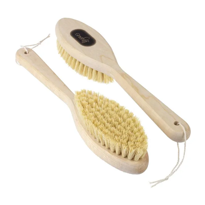 Корпус этой массажной щетки изготовлен из бука – натуральной прочной древесины, обладающей высокими эксплуатационными качествами. Густая щетина выполнена из волокон сизаля, которые представляют собой достаточно жесткий материал, получаемый из листьев агавы. Щетка оснащена эргономичной ручкой, имеет овальную форму, оптимальную для проведения комплексного массажа.