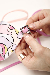 Пряжки со стразами, трикотажный шнур, нитки и иголки. Добавить к купальнику несколько блестящих кокетливых деталей очень легко. Разрезав полоску между чашечками и боковую резинку на плавках, вставляем пряжки. Затем сшиваем либо соединяем детали купальника при помощи тесьмы, завязанной на бант.