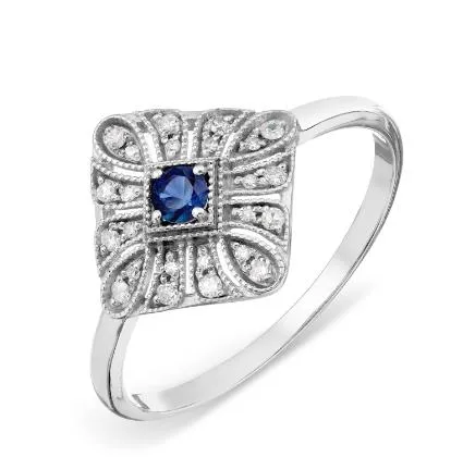 Не секрет, что кольцо, центральный камень которого находится в окружении других камней, выглядит более роскошным. В этом кольце с сапфиром и бриллиантами из белого золота, центральный круглый сапфир находится на очень необычной ромбовидной площадке.