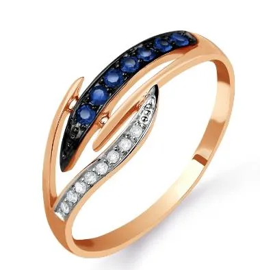 Работы современных ювелиров более разнообразны. Кольцо с сапфирами и бриллиантами в виде россыпи небольших камней, украшающих 2 золотые ветки – одна из таких вариаций. Оно выполнено из красного золота и украшено 8 бриллиантами и 7 сапфирами.