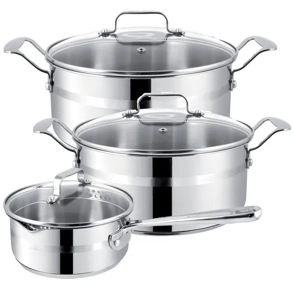 В наборе представлены большая и средняя кастрюли, ковш с ручкой и стеклянные крышки. Посуда выполнена из качественной нержавеющей стали — служит долго и отлично сохраняет качество еды.