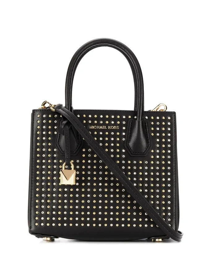 Черная сумка-тоут с золотыми заклепками добавит остроты в образ. Несмотря на довольно компактный размер, модель вмещает в себя все самое необходимое: от мобильника и кредитки до расчески, блеска и косметички. Она будет гармонично смотреться как с повседневной одеждой, так и с нарядом на вечер. Носить ее можно в руках или повесить через плечо с помощью длинного ремешка, тем самым освободив руки.