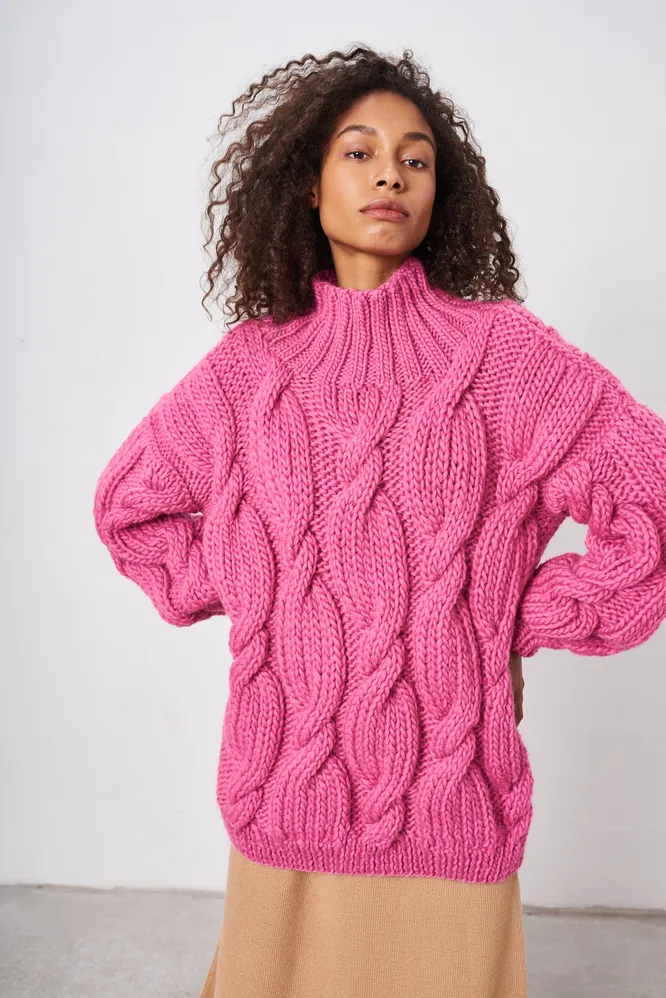 Уютный вязаный свитер кукольно-розового цвета не только согреет рыбку в непогоду, но и поднимет ей настроение в хмурый день. Мягкая, теплая модель яркого оттенка послужит акцентом в гардеробе и станет отличным дополнением как для повседневного образа, так и для наряда на выход. В первом случае носим его с джинсами или строгими брюками, а во втором — сочетаем с воздушной юбкой миди и ботильонами kitten heels.