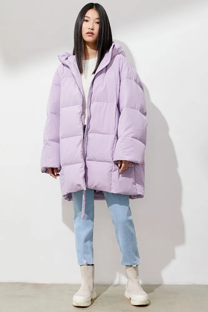 На фоне многочисленных стеганных пальто и курток модели с абсолютно гладкой фактурой определенно выделяются, кроме того, за счет ровной поверхности они смотрятся менее габаритно. В этом пуховике есть все, чтобы сделать твою зиму уютной и комфортной. Длина до середины бедра, непродуваемый материал, пух и перо в качестве утеплителя, свободная посадка, капюшон. В такой экипировке не страшны никакие морозы!