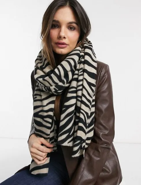 Поклонницам анималистичных мотивов советуем обратить внимание на шарфы с тигриным принтом или «зеброй». Они не такие кричащие, как леопардовый и змеиный узоры, поэтому легко впишутся в повседневные луки, не привлекая к себе много внимания.
