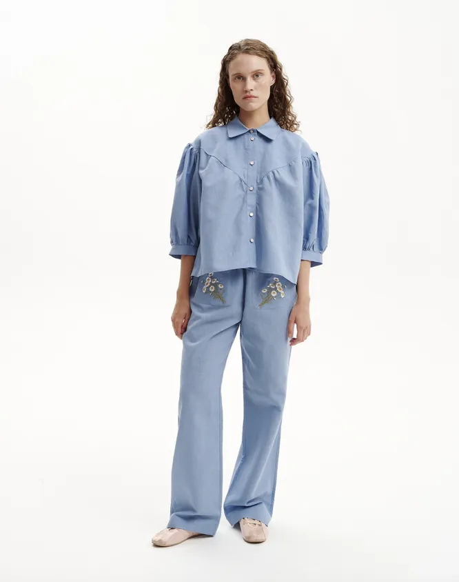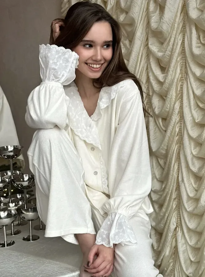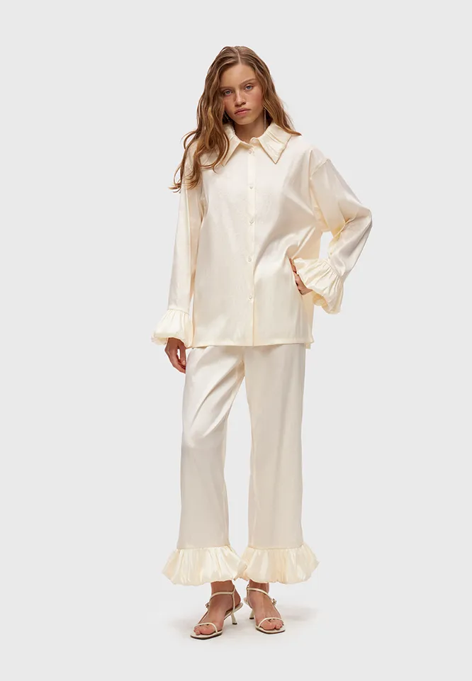 Но популярны сейчас не только сеты с рубашкой и палаццо. Инфлюэнсеры особенно полюбили комбо из блузы и чуть укороченных брюк, украшенных крупными воланами. Это еще одно проявление коттеджкора – деревенского стиля. Для лета самое то! Чтобы не переборщить с расслабленностью, просто дополни образ аксессуарами и обувью с четкими линиями (металлические серьги и кожаные мюли отлично подойдут). Так мягкий костюм уравновесится чем-то более строгим.