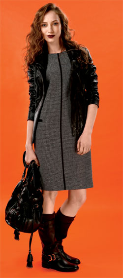 Работаем на контрастах – платье-футляр из классического твида носим с косухой и брутальными сапогами. Найти все эти вещи можно и у вполне демократичных марок, а наиболее привлекательная часть комплекта – голые коленки – вообще ничего не стоит!