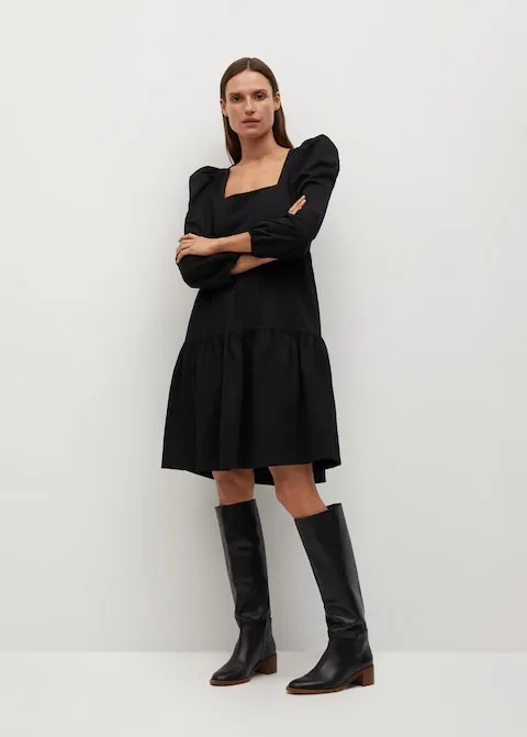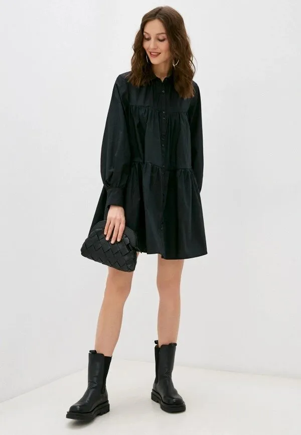 Романтичное черное платье с пышными рукавами и ярусным фасоном идеально сочетается с сапогами с широким голенищем. Летом вещь можно комбинировать с пушистыми шлепками или сандалиями с перемычкой.