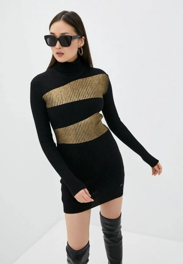 Короткое платье с высокой горловиной — идеальное дополнение к трендовой обуви сезона. Носи облегающую модель с кожаными ботфортами или грубыми высокими ботинками.