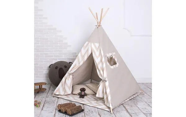 Опоры у домика для индейцев прочные, легкие, а сама конструкция устойчивая. Размер максимально соответствует детским параметрам и считается уютным – 110 х 110 х 155 см. Его можно приспособить для решения любых важных для детей задач. Только не забудь дополнить вигвам аксессуарами – пледом или диванными подушками.