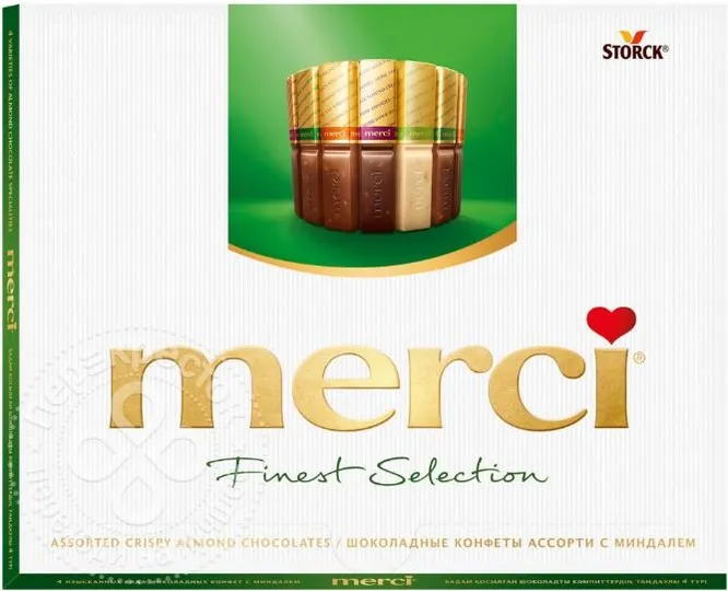 Эти конфеты интересны названием – «Мерси». В переводе с французского оно означает «Спасибо». Многие согласятся, что это очень тонкий способ выразить благодарность человеку за все приятные моменты, которые случились в уходящем году. В набор входит 4 вида шоколада с миндалем.