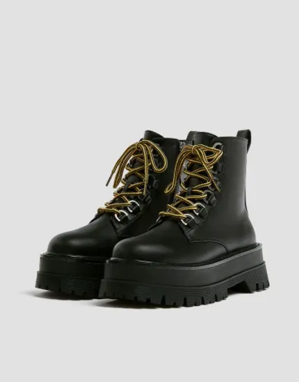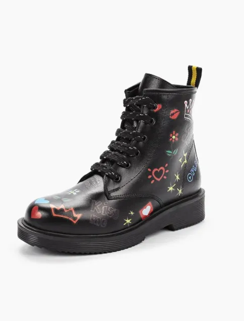 Особую популярность в этом сезоне обрели ботинки на шнуровке с принтами. Дизайнеры украшают грубую обувь разными рисунками: смайликами, цветами, карикатурными изображениями животных, простыми граффити, надписями и так далее. Такая обувь интересно смотрится в любом аутфите, будь то ансамбль из базовых вещей или трендовый лук в уличном стиле с налетом азиатского футуризма.