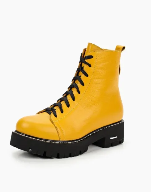 Тем, кто не собирается отказываться от яркого цвета в образе даже в лютые морозы, грязь и слякоть, предлагаем обратить внимание на ботинки из цветной кожи. Чтобы они органично смотрелись в осенне-зимних луках, выбирай модели слегка приглушенных оттенков. Например, вместо оранжевого – янтарный с оранжевым подтоном, вместо канареечно-желтого – горчичный. И еще совет: не увлекайся яркими аксессуарами, иначе рискуешь стать похожей на светофор. Пусть акцентами в образе будут только яркие ботинки и, к примеру, шапка.