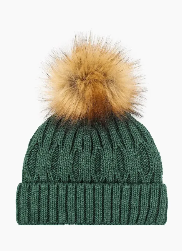 Удачным вариантом на каждый день станет зимняя вязаная шапка с большим меховым помпоном. Модель в глубоком изумрудном цвете легко впишется в образы как с черным пуховиком, так и с кремовым пальто. Дополнить ее можно шарфом любого цвета, но лучше всего будет смотреться варианты рыжего, белого, бежевого оттенков. Шапка имеет флисовую подкладку и на 50% состоит из натурально шерсти, поэтому она будет хорошо согревать и удерживать тепло.