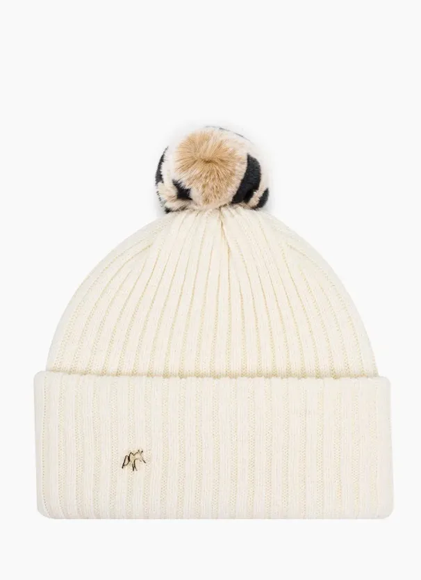 Еще одна интересная модель – белая шапка с разноцветным помпоном. Нейтральный головной убор легко сочетать с любой верхней одеждой и аксессуарами. Кроме того, она поможет освежить зимние образы и не будет «прятать» лицо. В пару к ней советуем подобрать вязаный шарф с гладкой фактурой или в «косичку». Шапка выполнена из плотного структурированного трикотажа, поэтому она будет органично и пропорционально смотреться даже с очень объемной верхней одеждой.