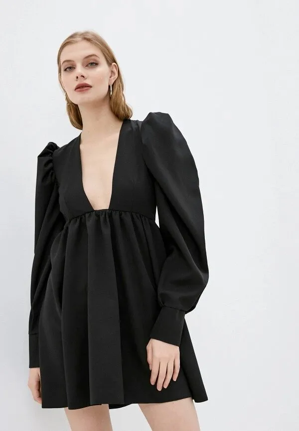 Минималистичное платье с объемными рукавами и глубоким декольте сможет не только удачно вписаться в твой новогодний образ, но и продолжить свою историю в повседневных комплектах.