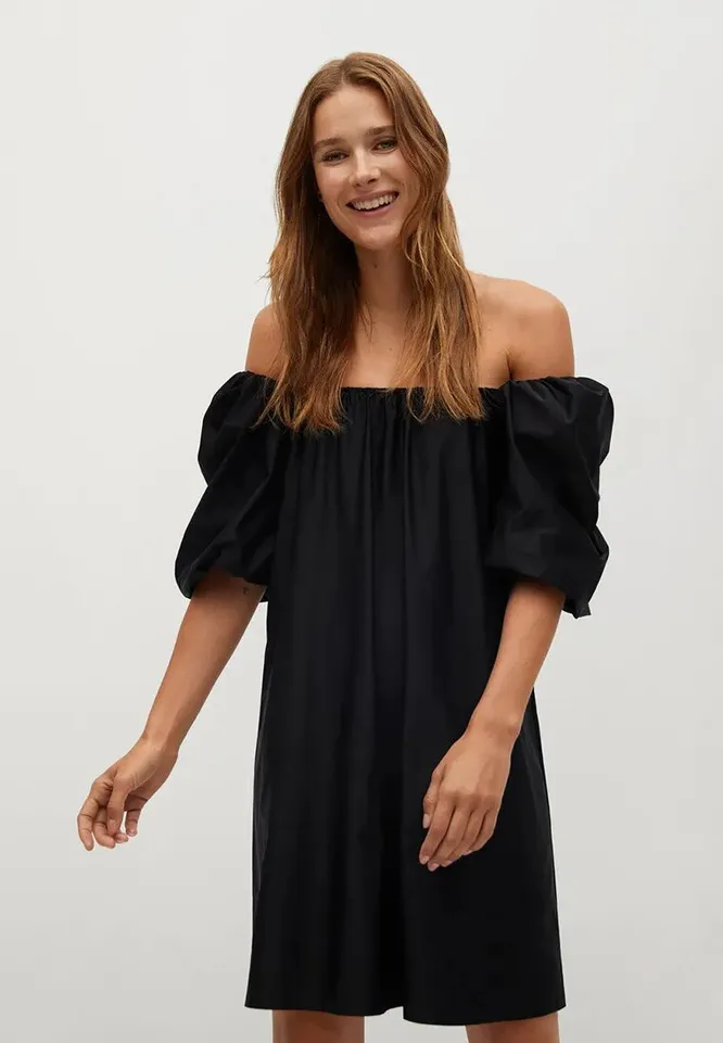Аккуратное платье объединяет в себе сразу два тренда — открытые плечи и пышные рукава.