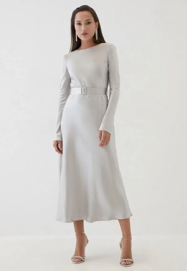 Если ты не любишь открытые фасоны, примеряй белое платье из сияющей ткани. На новогодний корпоратив надень его с туфлями с ремешком на щиколотке и длинными серьгами.