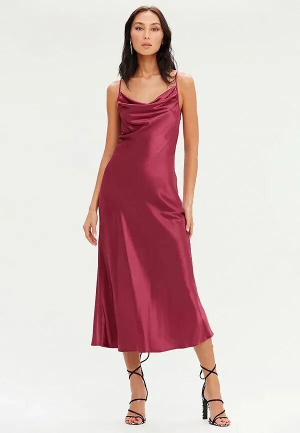 Длинное платье-комбинацию холодного ягодного оттенка в новогоднюю ночь можно комбинировать с базовыми черными босоножками.