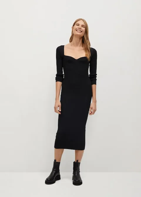 Облегающее платье с трендовым сердцевидным декольте гармонично смотрится и с ботинками, и с аккуратными лодочками.