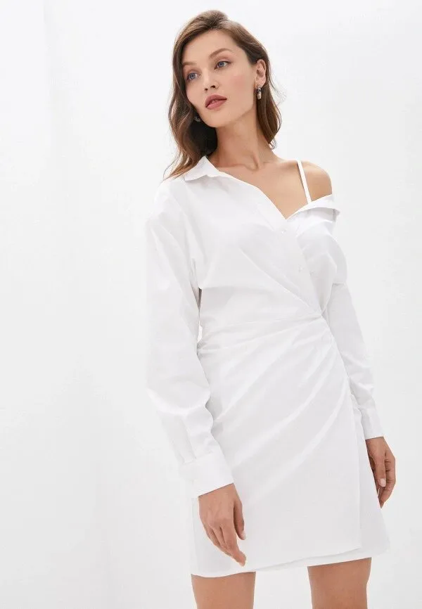 Платья рубашечного фасона можно носить не только на деловые встречи. Для новогоднего образа выбирай белоснежную модель на одно плечо и комбинируй ее с черными лодочками.