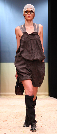 Льняная часть коллекции вызывала в памяти творения японского концептуалиста Йоджи Ямамото: просторные прямые брюки, нарочито длинные – так, что полностью закрывают обувь; широкие и короткие комбинезоны, скроенные словно на несколько размеров больше и удерживающиеся на бретелях, похожих на подтяжки; топы без бретелей, похожие на сложенные из бумаги фигурки-оригами; объемные сорочки, закрывающие бедра и в сочетании с топами создающие эффект уютной, слегка расхлябанной многослойности.