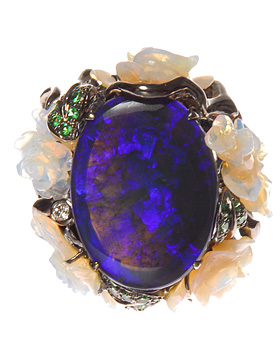 В завершении хотим обратить внимание на эффектное кольцо с центральным опалом необыкновенного переливчатого василького цвета. Ореолом и фоном, оттеняющим ясную чуть холодную красоту опала служат прозрачные розы из лунного камня, зеленые гранаты и искрящиеся бриллианты.
