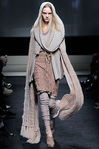 Здесь мне все очень понравилось. Традиционный для Missoni трикотаж и многослойность сохраняется. Стиль грандж, который был некоторое время очень популярен (его еще очень любит Марк Джейкобс) у Missoni в фаворе. Каждый комплект — это не просто водолазка и брюки, но обязательно еще и жакет, кардиган или пальто. Причем все пальто выглядят как большие мужские пиджаки. Очень был один забавный комплект — шифоновое платье, а поверх него трикотажное платье. В верхнем платье сделаны дырки, сквозь которые просвечивает нижнее платье.