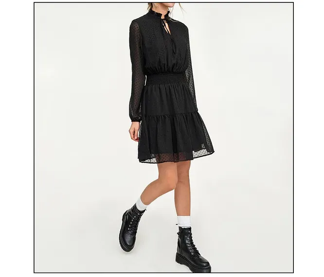 Такое платье хорошо сядет на любую фигуру. Модель сшита из полупрозрачного, воздушного материала. Юбка ярусная, эластичный пояс создает акцент на талии, при этом не обтягивая ее. Подойдет как для ежедневных прогулок, так и для выходного дня. Лучше всего будет смотреться с грубыми ботинками, ботильонами на толстом каблуке, челси и элегантными лодочками.