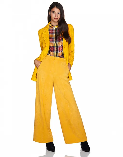 Для тех, кто любит быть в центре внимания, не упускает ни один тренд и уж точно не собирается мириться с серостью будней и российских реалий, – желтые вельветовые брюки широкого кроя. Носить такие стоит с более приглушенными оттенками, так как эта пара достаточно массивная и много берет на себя, но, если ты уверена в себе и имя твое Эпатаж, – вперед за жилетом в тон!