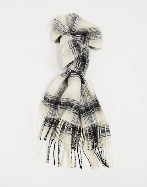 Выбираешь принтованные вязаные шарфы, но не знаешь, какие узоры сейчас в тренде? Делай ставку на клетку и не прогадаешь. Аксессуар от River Island дополнен еще одним актуальным пунктом — аккуратной бахромой.
