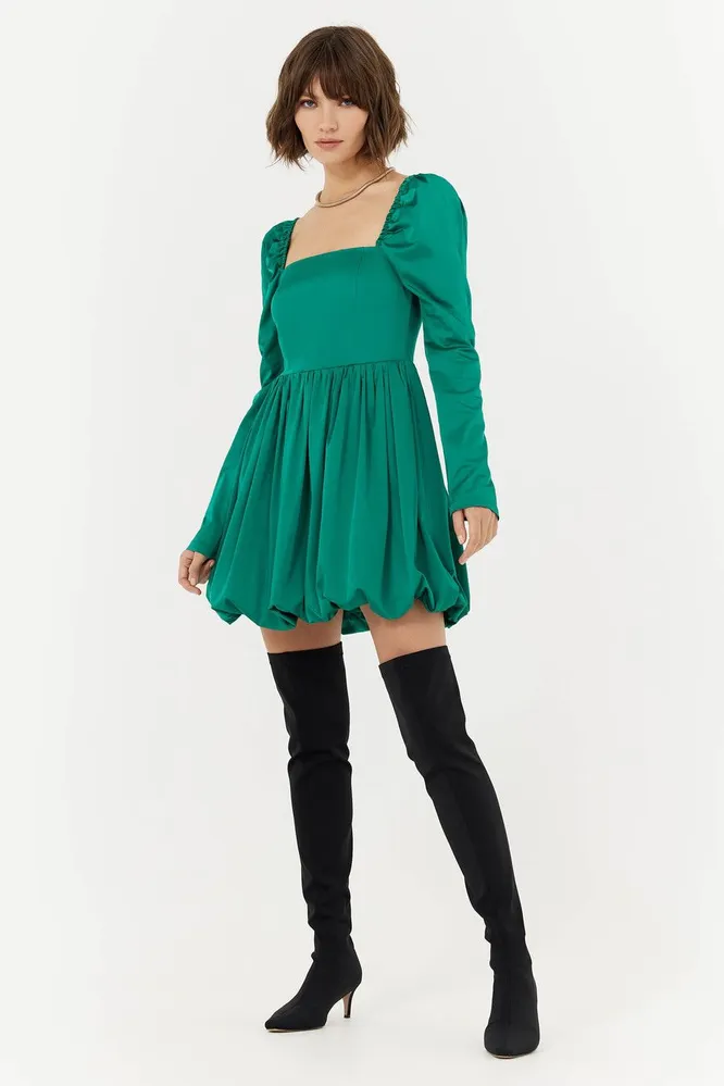 Вырез каре подчеркивает шею и ключицы, а на фоне объемных рукавов и пышной юбки талия кажется еще более тонкой и выразительной. Несмотря на мини длину, наряд смотрится сдержанно и элегантно — компенсировать смелый крой позволяют благородный цвет ткани и отсутствие декоративных элементов. Сочетай с классическими лодочками или узкими ботфортами и не слишком перегружай аксессуарами — пары акцентных деталей будет достаточно.