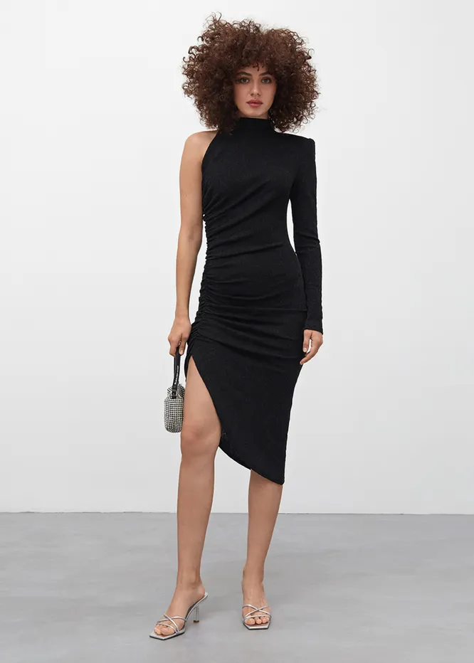 Асимметричный крой не только делает образ интереснее, но и зрительно подтягивают фигуру. Благодаря диагональным линиям, ты будешь казаться выше и стройнее, а облегающий фасон, в свою очередь, создаст форму. Если не можешь определиться — смело выбирай маленькое черное платье. Оно актуально в любой ситуации!